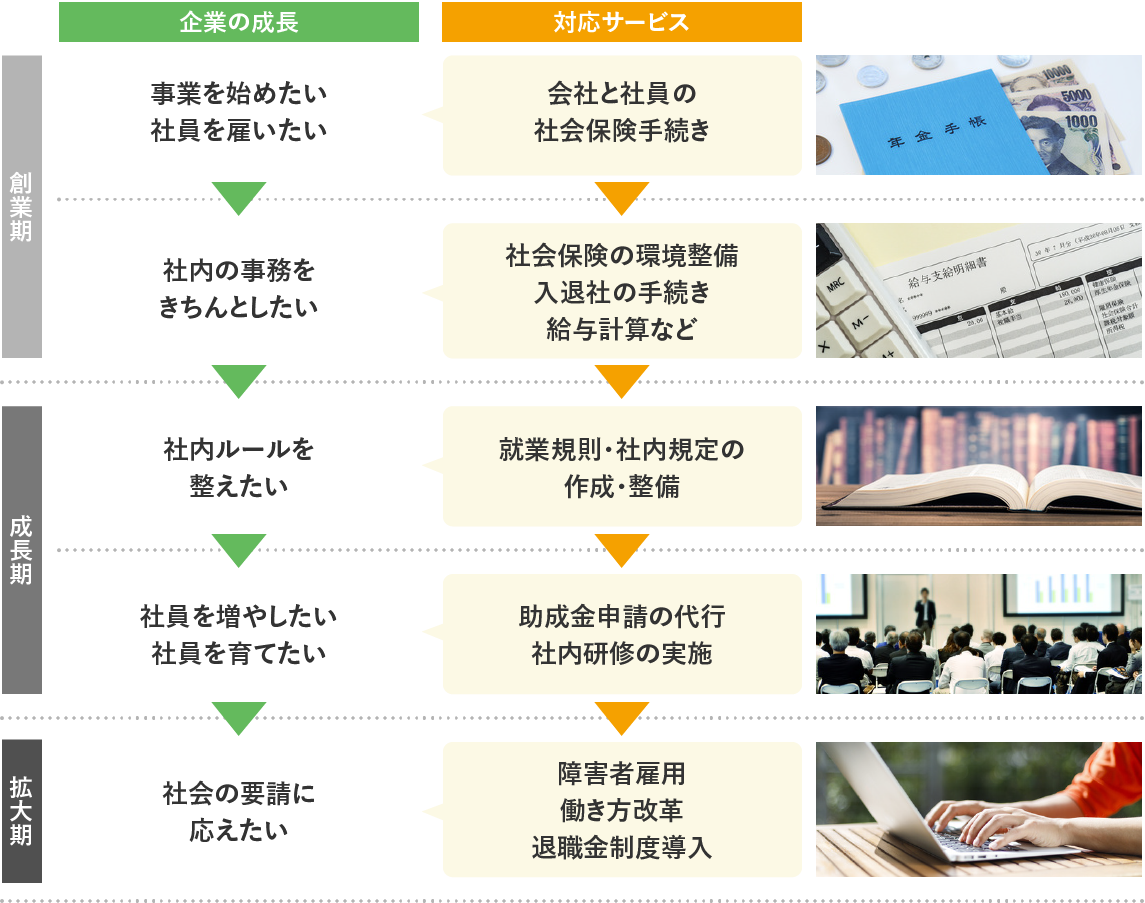 社会保険労務士と中小企業診断士のダブル資格保持者である代表が、法律面と経営面から御社の事業計画までしっかりアドバイスします。